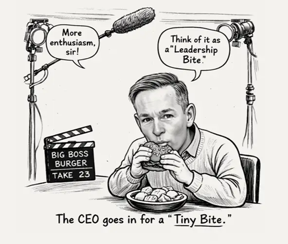 A CEO attempts to appear human while eating a hamburger. The camera tells another story.